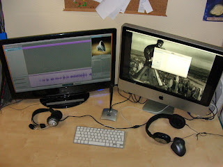 Esto es lo que solemos utilizar para grabar el podcast; micro de Logitech de 30€, Imac 24 con una pantalla extra y garage band, a veces usamos los cascos cuando grabamos por skype y los gordos de sennheiser para editar.